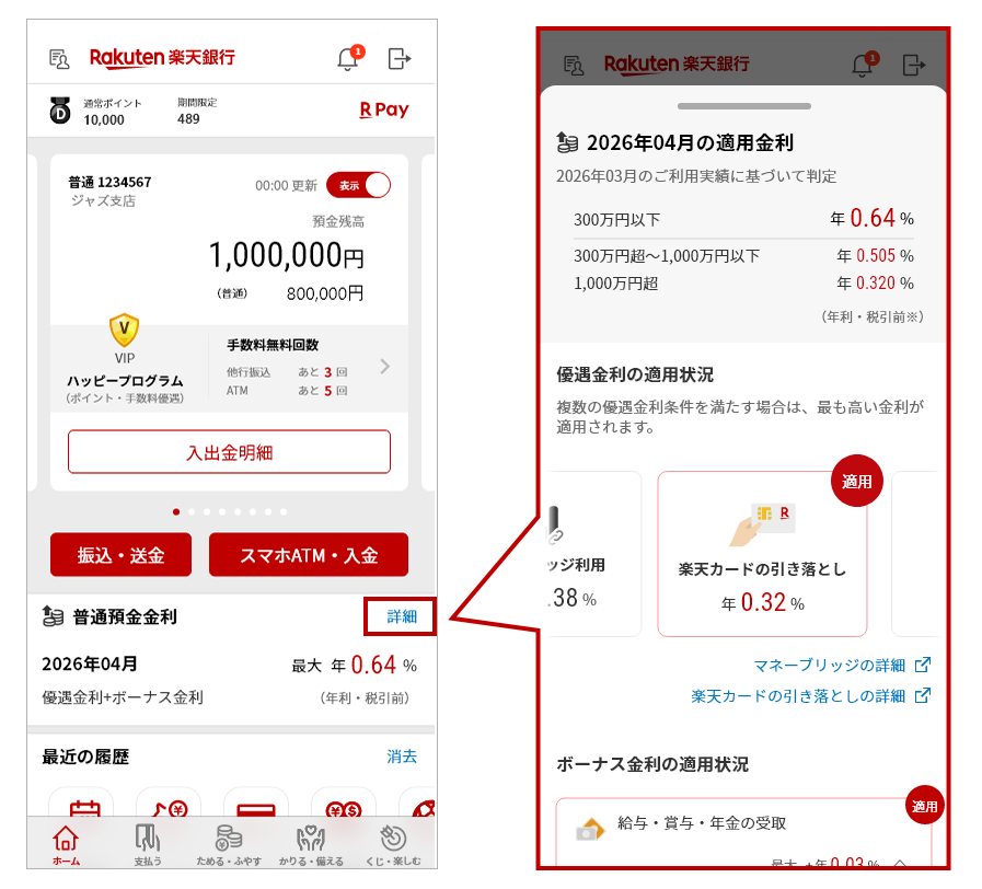 普通預金の金利優遇プログラム「ボーナス金利※」の適用金利を、楽天銀行アプリにて簡単にご確認いただけるようになりました。